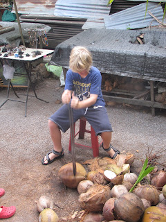 With my wallet considerably lighter, we boarded a bus to a local coconut farm. Aside from the obvious push from our tour guide to shop, shop, shop the farm was relatively interesting. I especially enjoyed the coconut sugar samples and watching a tiny older Thai lady break open coconut husks like they were paper. Each of the kids had a go at this but Nick was the only one able to even break the skin of the coconut.